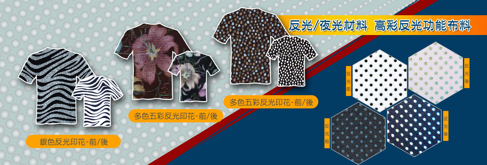 產品種類眾多,例如高亮度銀色反光、五彩反光印花布、色彩飽滿的有色反光膜,價格親民,歡迎紡織業界先進共同合作開發。